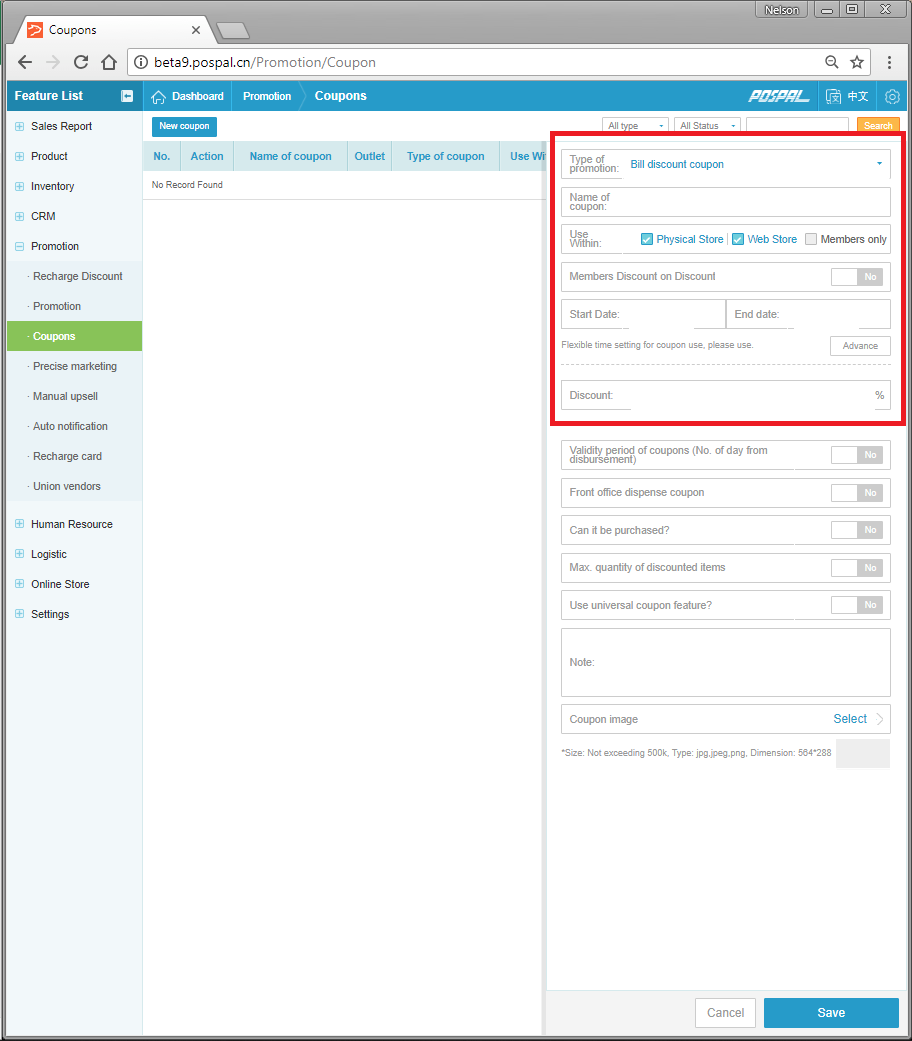 2. Select Coupons under Promotion Tab